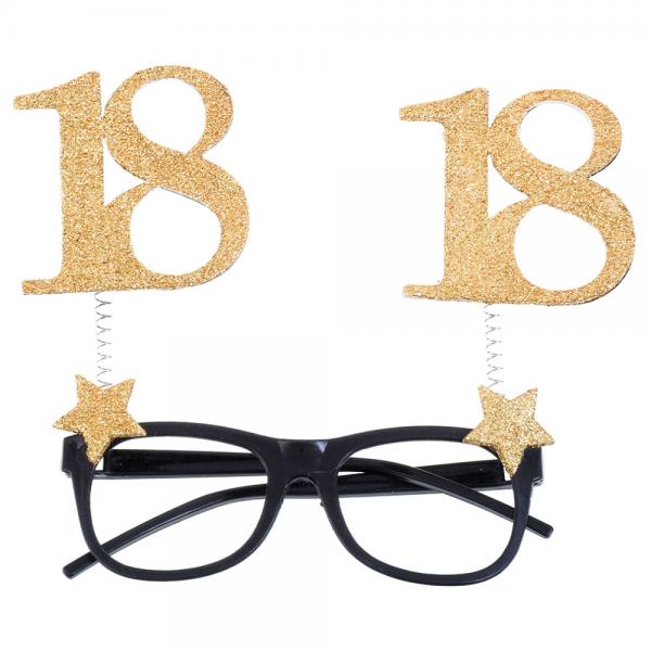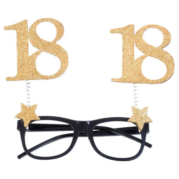 18 Års Glasögon Glitter Guld omfattar ett par svarta glasögon med guldglittriga stjärnor samt uppstickande "18" texter. Glasögonen är tillverkade av plast, är ca 14 cm breda och passar vuxna.