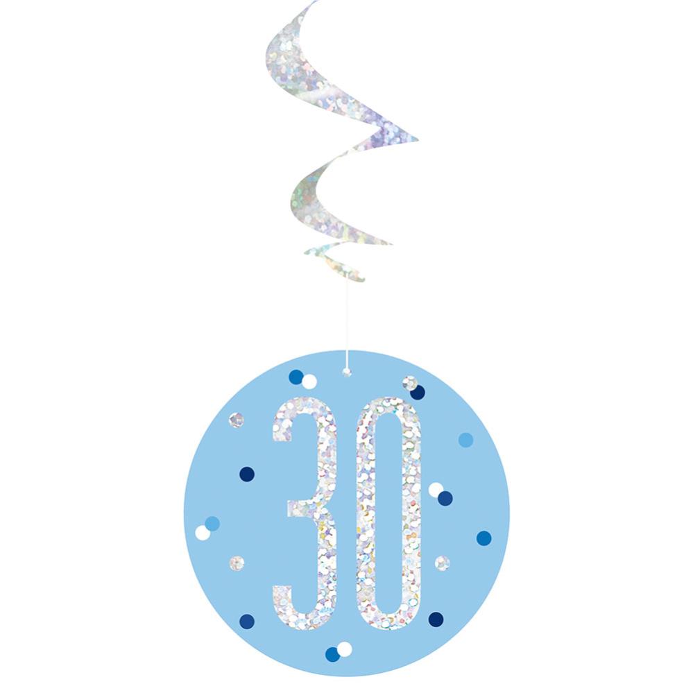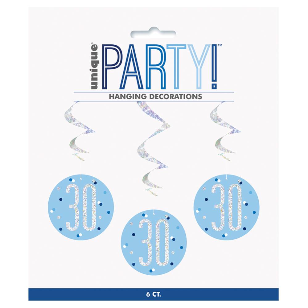 Fira din 30 års-fest med stil med dessa fantastiska 30 års-dekorationer! Med sex stycken hängande swirls i blått och silver, siffran "30" i holografiskt silver och prickar i blått, vitt och silver är dessa dekorationer ett måste på ditt 30 års kalas. Varje swirl är ca 70 cm lång och fästs enkelt upp med små plastögglor upptill. Tillverkade i papp och plast, säljs de i praktiska 6-pack så att du kan dekorera hela rummet i stil.