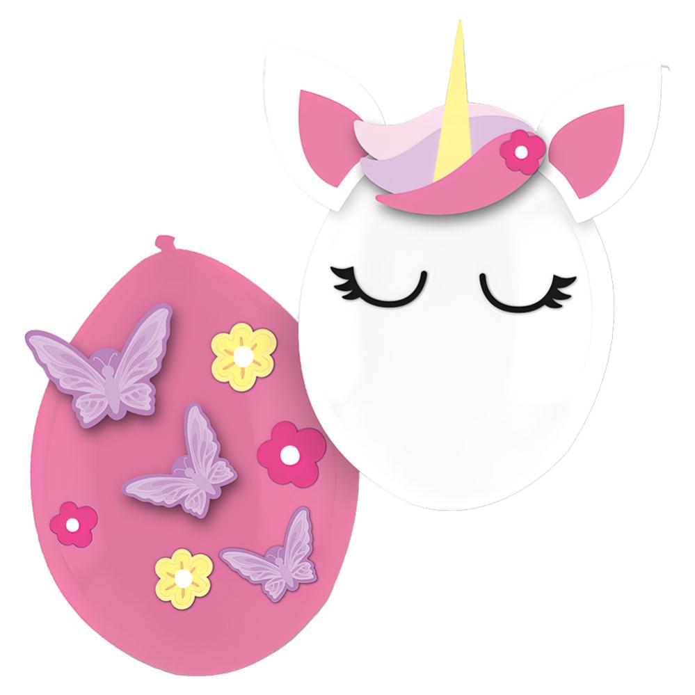 3D Latexballonger Set Princess omfattar ett set med rosa och vita ballonger samt pappersdekorationer och klistermärken i form av fjärilar, blommor och en enhörning. Blås upp ballongerna och dekorera dem med klistermärkena och pappdekorationerna. Pappdekorationerna fästs med medföljande klisterlappar.