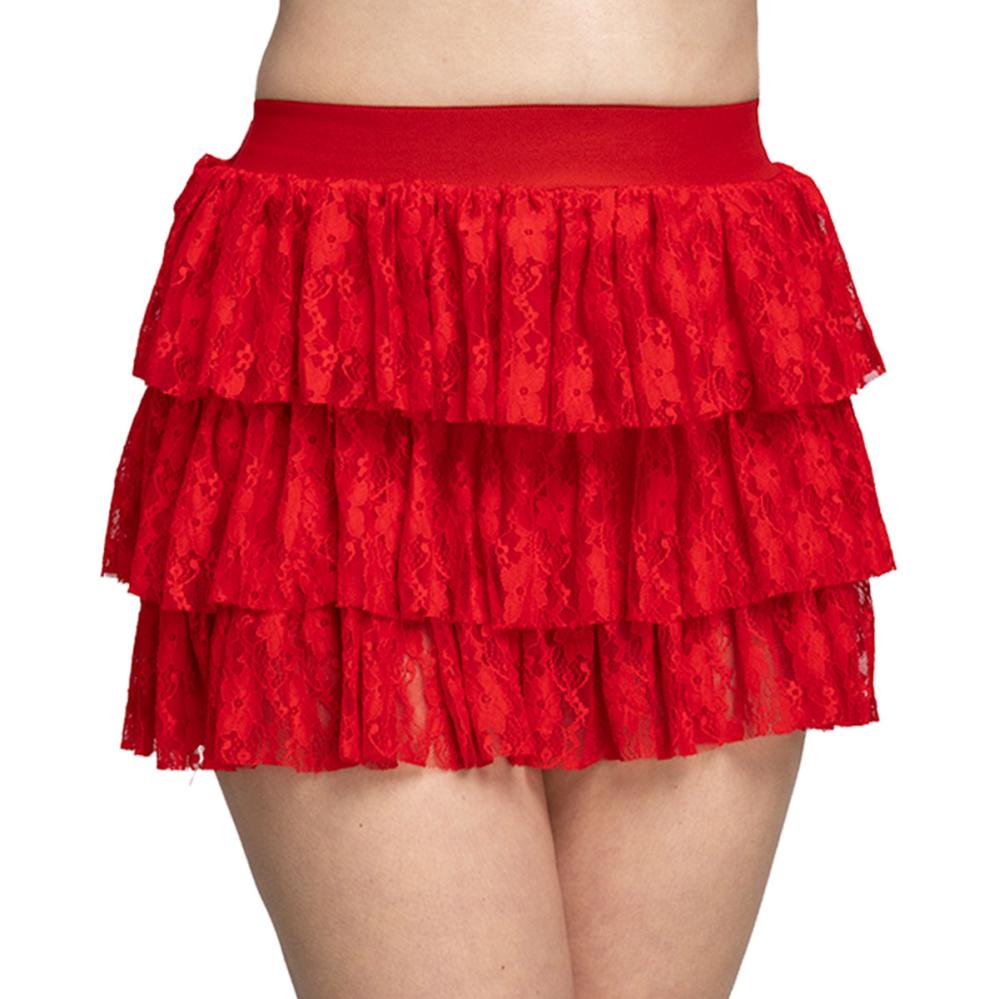 Sätt stilen på nästa 80-talsfest med en röd spetskjol som har tre lager med volanger och en skön resårmidja. Detta är en perfekt kjol till en 80-talsutklädnad för maskerad eller när du behöver unika kläder på en fest.