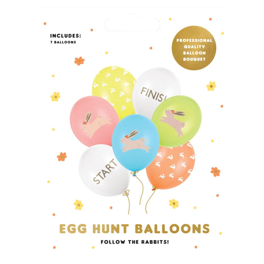 Äggjakt Latexballonger omfattar ballonger i latex med påsktema. Ballongerna finns i ljusgrönt, ljusrosa och ljusblått med motiv av en skuttande kanin, i orange och gult med små vita kaniner samt vita ballonger, en med texten "Start" och en med texten "Finish". Ballongerna är ca 30 cm stora, rymmer ca 15 liter och fylls med helium eller luft.