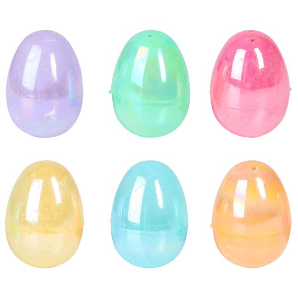 Äggjaktsägg Färgmix Pastell 6 cm 12-pack innehåller tolv plastägg i pastellfärgerna rosa, orange, gul, grön, blå och lila som kan öppnas i mitten.
