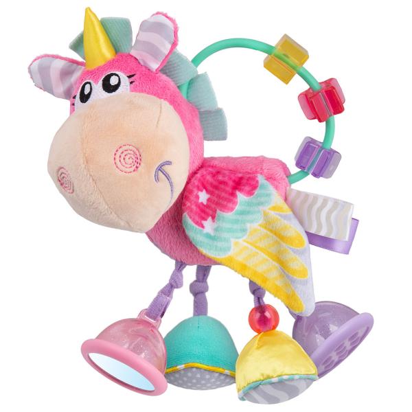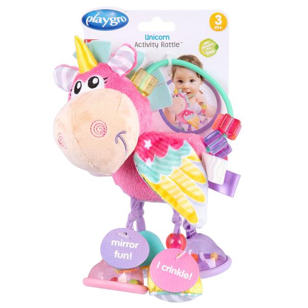 Aktivitetsleksak Enhörning omfattar en flerfärgad aktivitetsleksak i form av en rosa enhörning med en skallra, en spegel och prasselljud.