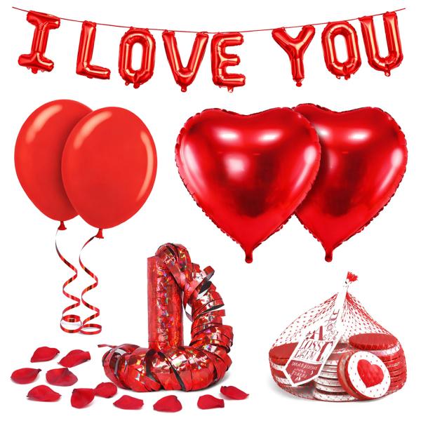 I paketet får du en röd ballonggirlang med texten I LOVE YOU som blir en självklar blickfångare och fungerar perfekt som Alla hjärtans dag ballongdekoration. Tillsammans med röda latexballonger och röda hjärtballonger i folie skapar du en enhetlig dekoration som passar lika bra till överraskning, romantisk date eller fest. Som extra detaljer ingår även rosenblad och röd metallic serpentin som lyfter helheten och gör pyntet mer levande. För större ytor kan du enkelt komplettera med fler Alla hjärtans dag ballonger och annat Alla hjärtans dag pynt ur vårt sortiment.