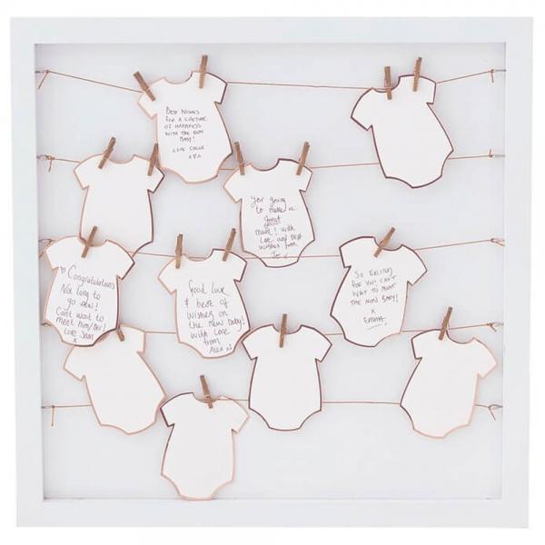 Vill du föreviga den speciella dagen, men känner att en gästbok inte riktigt är rätt? Då kan denna baby shower gästboks-ram vara det perfekta alternativet för dig! En riktigt fin ram med spända snören som gästerna enkelt fäster sina hälsningar på. Denna gästboks-ram är ett perfekt tillbehör och dekoration för både baby showers och dop, som även blir ett fint minne och en super fin inredningsdetalj i barnets rum.