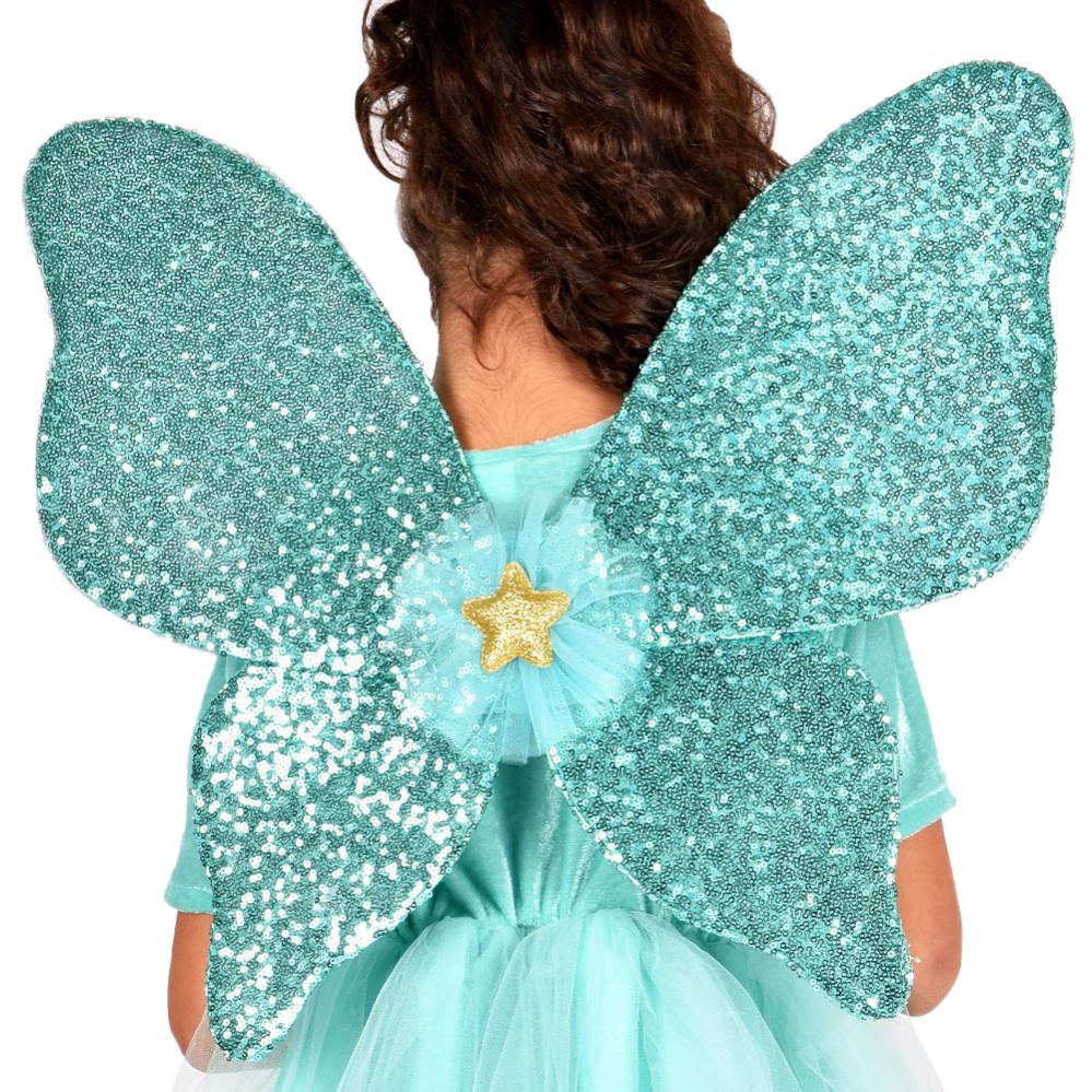 Älvvingar Skimrande Turkos omfattar ett par turkosa vingar i tyg klädda i paljetter med en guldglittrig stjärna där vingarna möts. Hålls på plats med guldglittriga elastiska axelband.