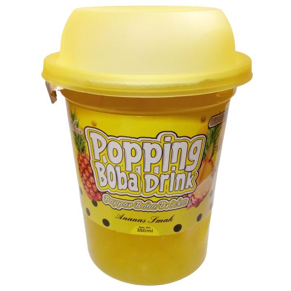 Ananasdryck med Poppar Boba 350 ml är en ananasdryck med poppar boba i en 350 ml plastmugg med ett papperssugrör.
