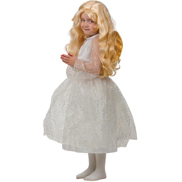 Ängel Barn Maskeraddräkt består av en vit klänning med fastsatt tyllkjol samt tryckta guldstjärnor på både kjol och ärmar. Det ingår dessutom ett par guldfärgade änglavingar samt ett matchande bälte.