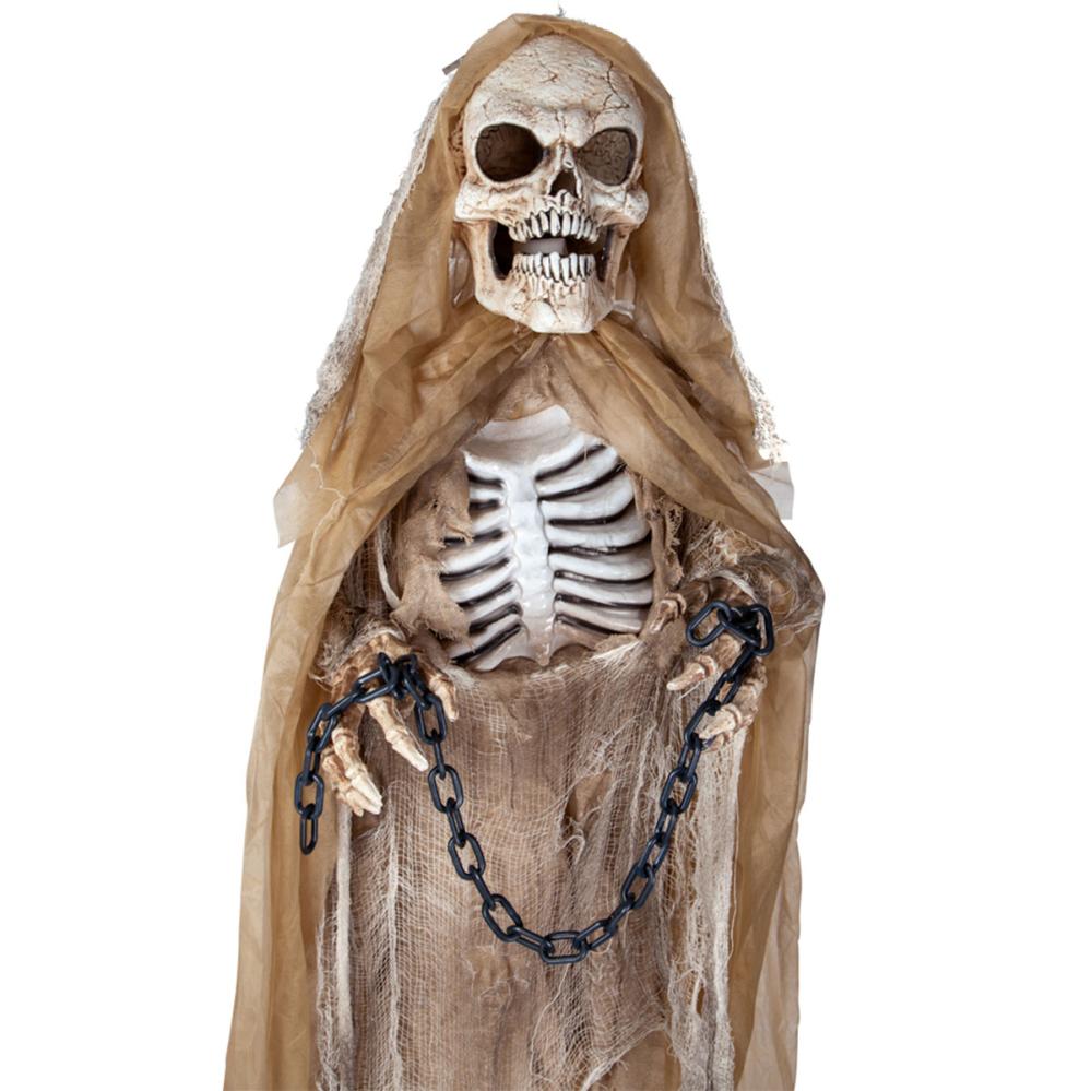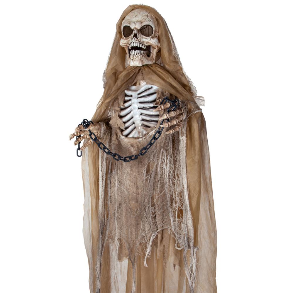 Skräm slag på gästerna med denna animatroniska Halloween-rekvisita! Detta är en animerad Halloweendekoration som föreställer ett skelett som tjuter, lyser och skakar loss med kedjorna. Den är perfekt för dig som vill ha en halloweendekoration med ljus, ljud och rörelse.