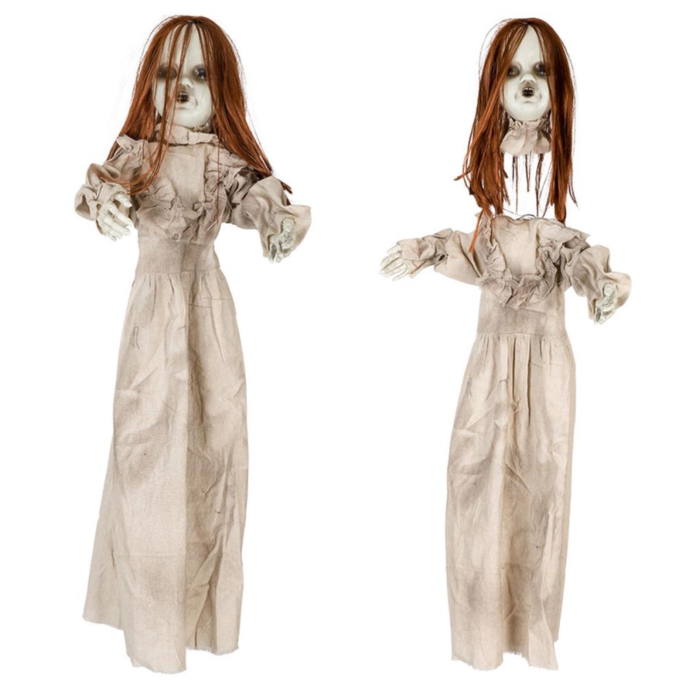 Animerad Hängande Skräckdocka Prop 110 cm är en hängande halloweendekoration som föreställer en läskig docka med rörelse, ljus och ljud. Dockan har ett verklighetstroget utseende med långt rufsigt hår, ett blekt ansikte och en sliten vit klänning. Vid aktivering svävar dockans huvud upp, ger ifrån sig läskiga ljud och lyser upp.