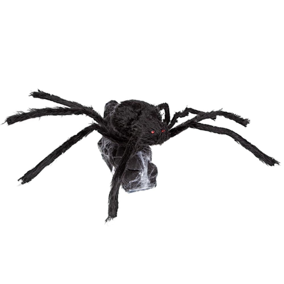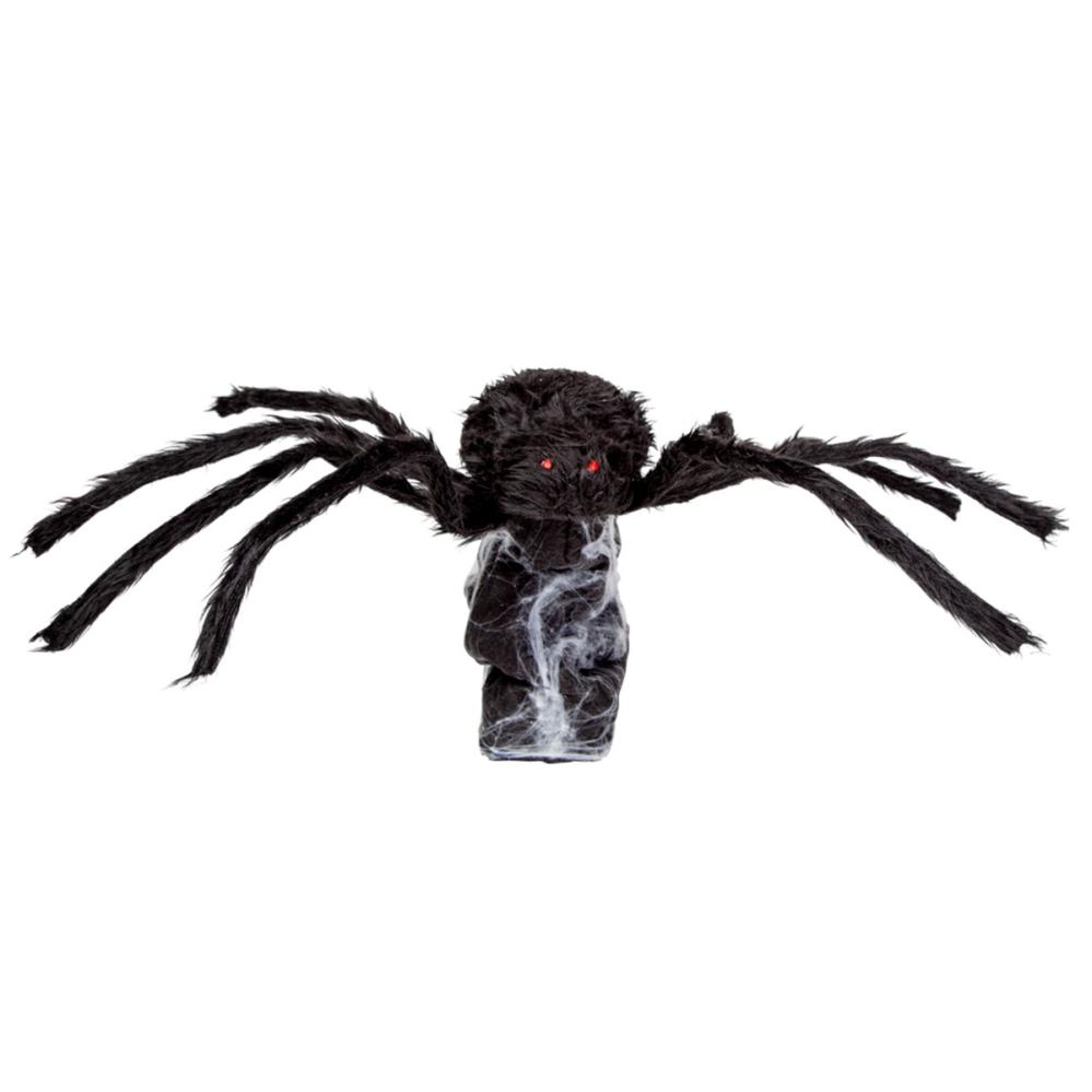 Animerad Läskig Hoppande Spindel 70 cm omfattar en Halloween-rekvisita med ljudaktivering som föreställer en stor, hårig svart spindel med ljud, ljus och rörelse. Spindelns ben är formbara och den sitter på en liten plattform som är täckt med vitt spindelnät. När den aktiveras kastar sig spindeln fram, med rödblinkande ögon och ett skrämmande ljud. Därefter spelas en kort melodi medan den långsamt drar sig tillbaka. OBS! Det finns en dold på/av-knapp under spindelnätet som används för att slå på det ljudaktiverade läget.