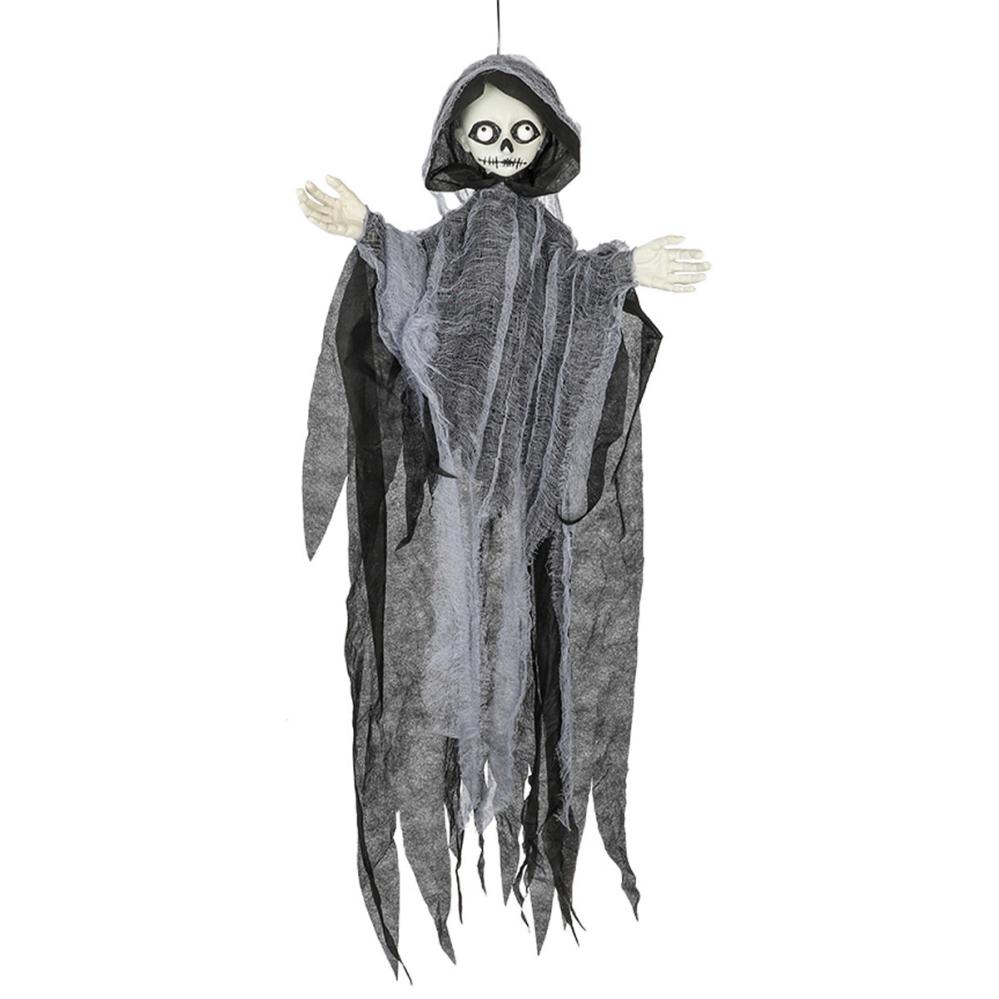 Animerad Sjungande Spökflicka Prop 110 cm är en läskig hängande spökflicka med rörelse, ljus och ljud. Denna batteridrivna halloweenfigur har ett sminkat ansikte med stirrande ögon och en sliten kåpa i svart och vitt. Vid ljudaktivering lyser ögonen, kroppen rör sig och hon både pratar och sjunger på engelska.