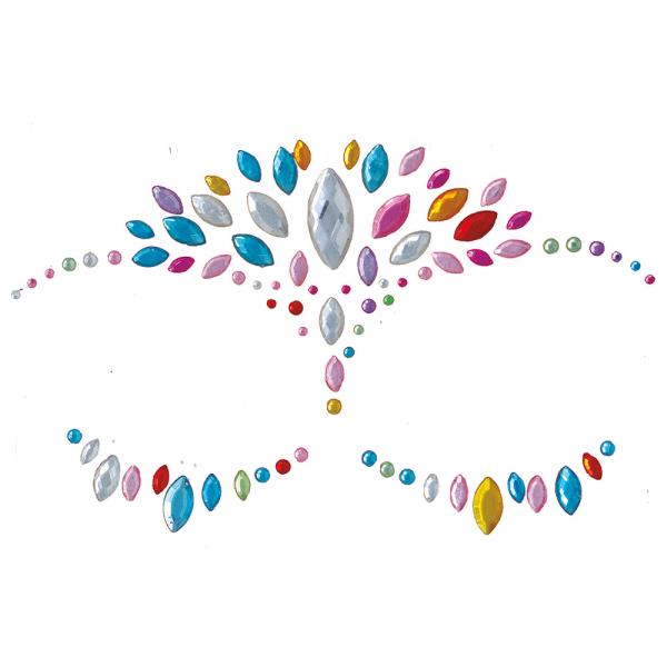 Ansiktssmycken Flerfärgad består av tre ansiktssmycken med flerfärgade plastdiamanter som sitter på genomskinliga stickers med självhäftande baksida. Applicera ansiktssmycket genom att försiktigt dra av hela stickern från plasten och tryck det mot ren och torr hud.