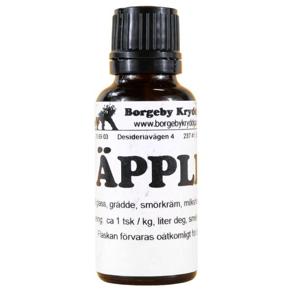 Äppelarom Borgeby Kryddgård omfattar 25 ml smaksättare med smak av äpple som används till exempelvis glass, grädde, smörkräm, milkshake m.m. Addera ca 1 tsk per kg eller liter deg, smet eller kräm.