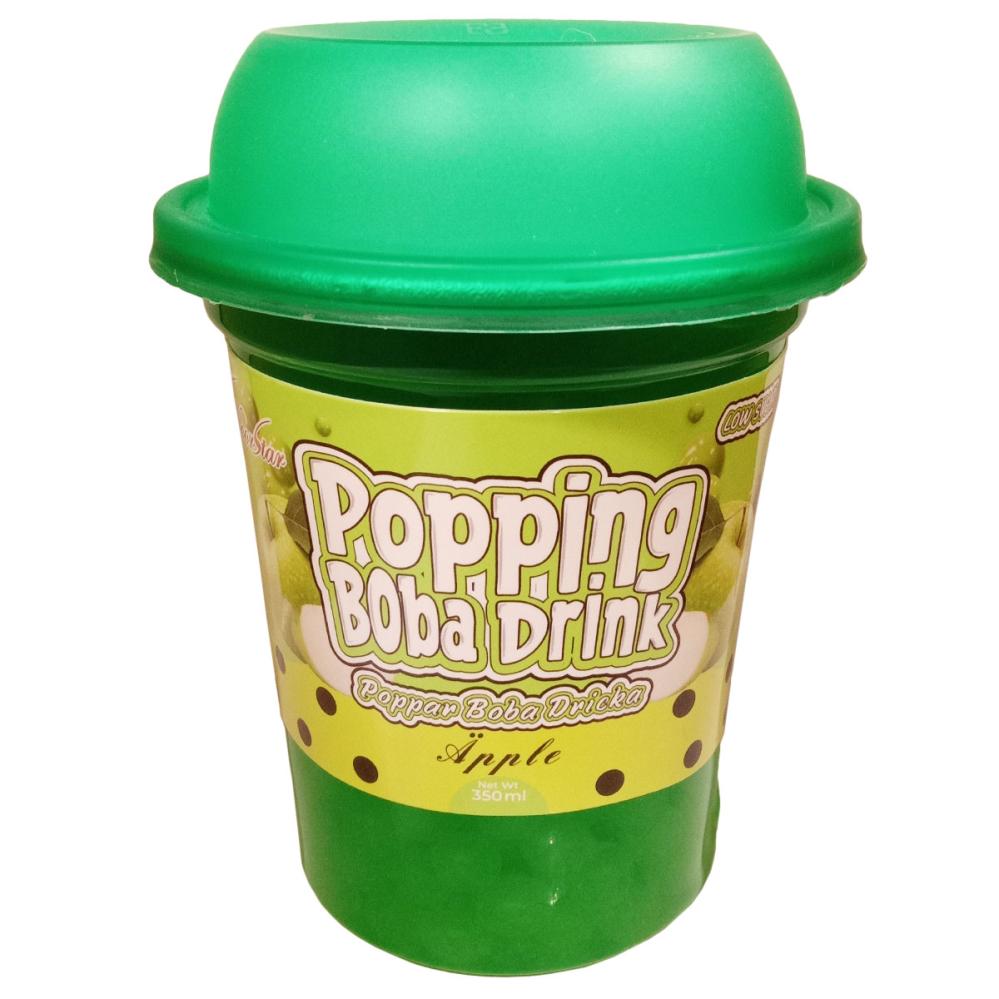 Äppeldryck med Poppar Boba 350 ml är en äppeldryck med poppar boba i en 350 ml plastmugg med ett papperssugrör.