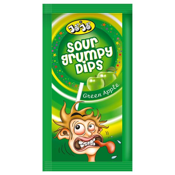 Pulver och dipp serveras till godiset och ger en tydlig äppelsyra och en sur smak. Äppelklubban rundar av smaken. Denna godisklubba har frisk äppelsyra. Resultatet blir ett syrligt äppelgodis.