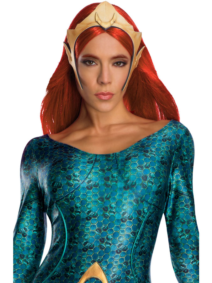 Aquaman Mera Maskeraddräkt Deluxe innehåller en skimrig Mera jumpsuit med tryckt mönster och guldiga detaljer, fastsydda fingerlösa handskar och matchande skoöverdrag. Ingår även och en guldig tiara.
