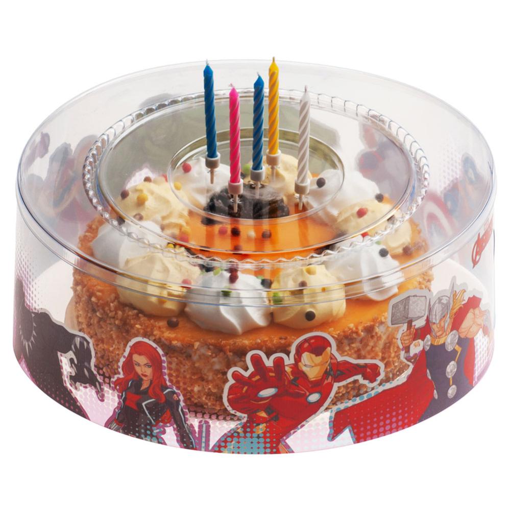 Avengers Tårtskydd med Lock omfattar ett tårtskydd och ett lock med Avengers-motiv. Den är tillverkad i plast och skyddar tårtan på ett snyggt sätt. Locket har även hål för tårtljus. Skyddet och locket passar till tårtor som mäter upp till 25 cm i diameter.