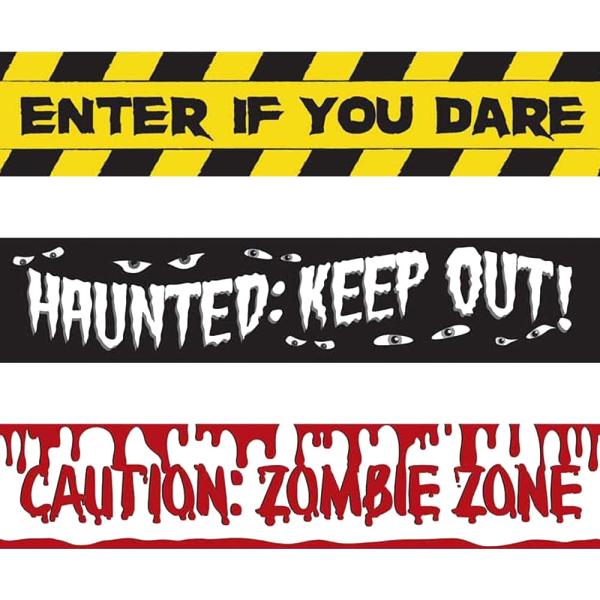 Avspärrningsband Halloween Dekoration 3-pack omfattar dekoration i form av tre läskiga varnings remsor. Ena remsan är gul och svart med texten "Enter if you dare", den andra är vit med röda detaljer som liknar blod samt texten " Caution Zombie Zone" samt det tredje är svart och vitt med ögon som tittar ut samt texten " Haunted: Keep Out".