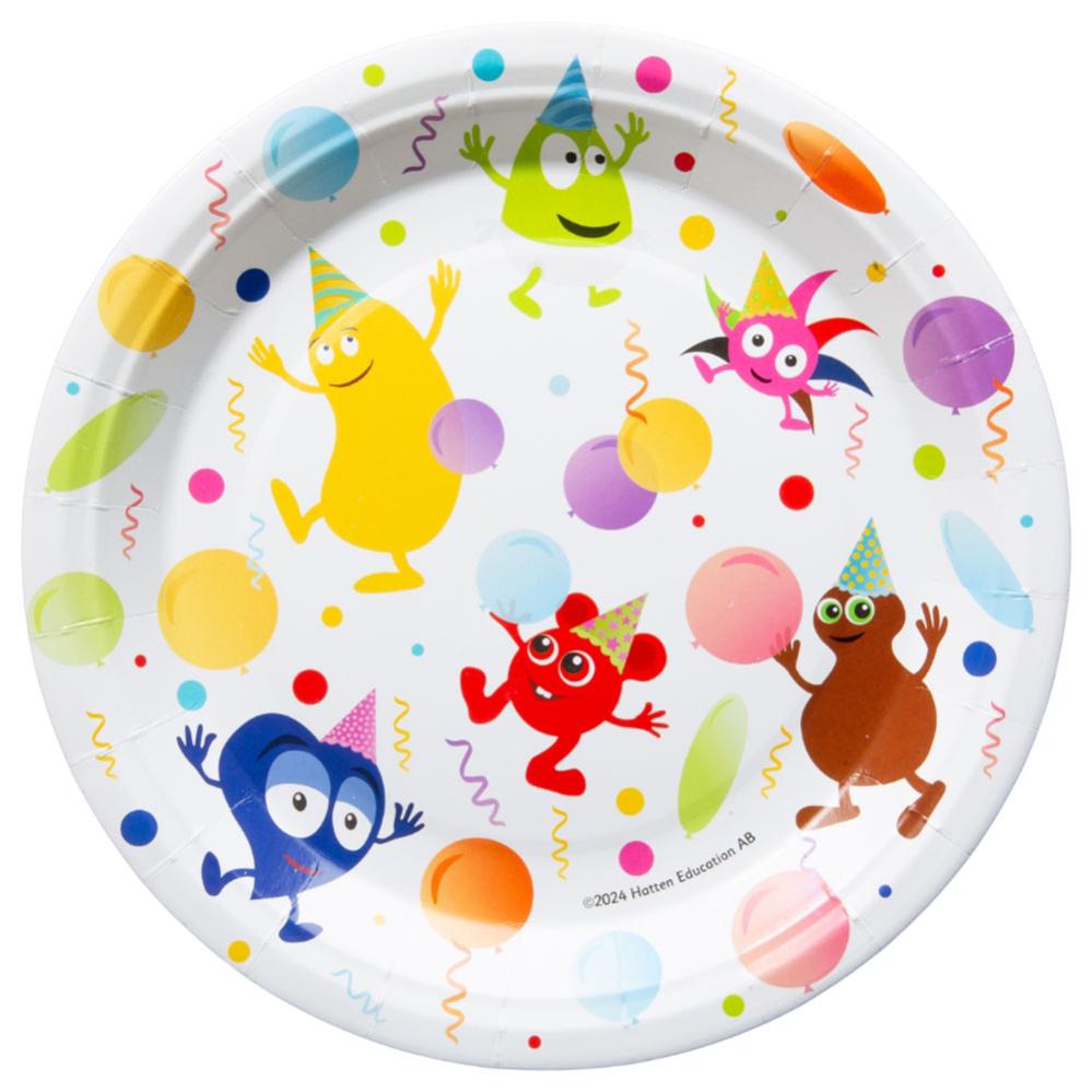 Babblarna Papperstallrikar omfattar en förpackning med 8 st vita papperstallrikar som har ett färgglatt motiv i form av kända figurerna från Babblarna. Tallrikarna har ett födelsedagstema då babblarna bär födelsedagshattar och har ballonger.