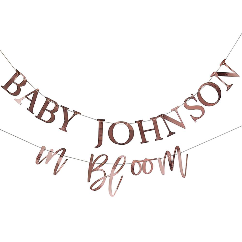 Skapa en personlig dekoration till din baby shower med denna fina baby in bloom girlang. En dekorativ baby shower girlang med roséguldiga bokstäver som du skapar din egen text med. Denna baby shower banderoll blir med andra ord en unik och personlig dekoration till bebisfesten.