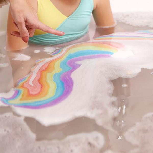 Badbomb med Regnbågsskum omfattar en jordgubbsdoftande badbomb med regnbågsfärgat skum. Badbomben finns med motiv av en enhörning och ett moln, vilken du får blir en överraskning.