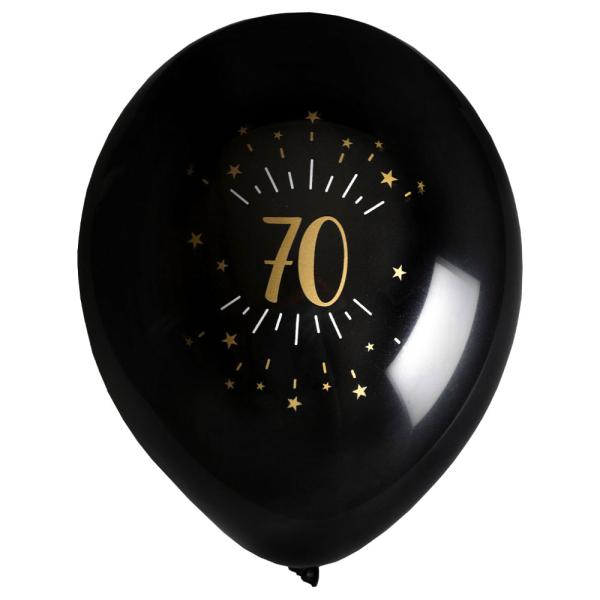 Ballonger 70 År Birthday Party Guld omfattar ett 8-pack svarta latexballonger med guldigt 70-års motiv. Ballongerna fylls med luft eller helium och blir ca 23 cm stora.
