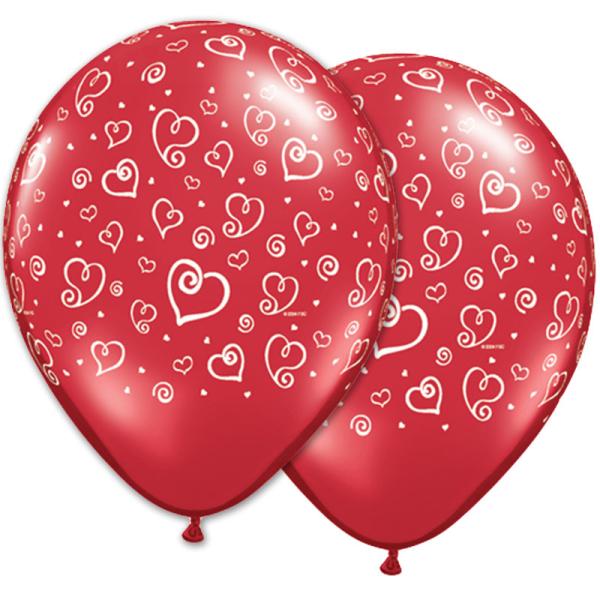 Ballonger med Hjärtan är tillverkade av naturgummilatex och kommer som rödfärgade med vita virvlar och hjärtan tryckta runtomkring.