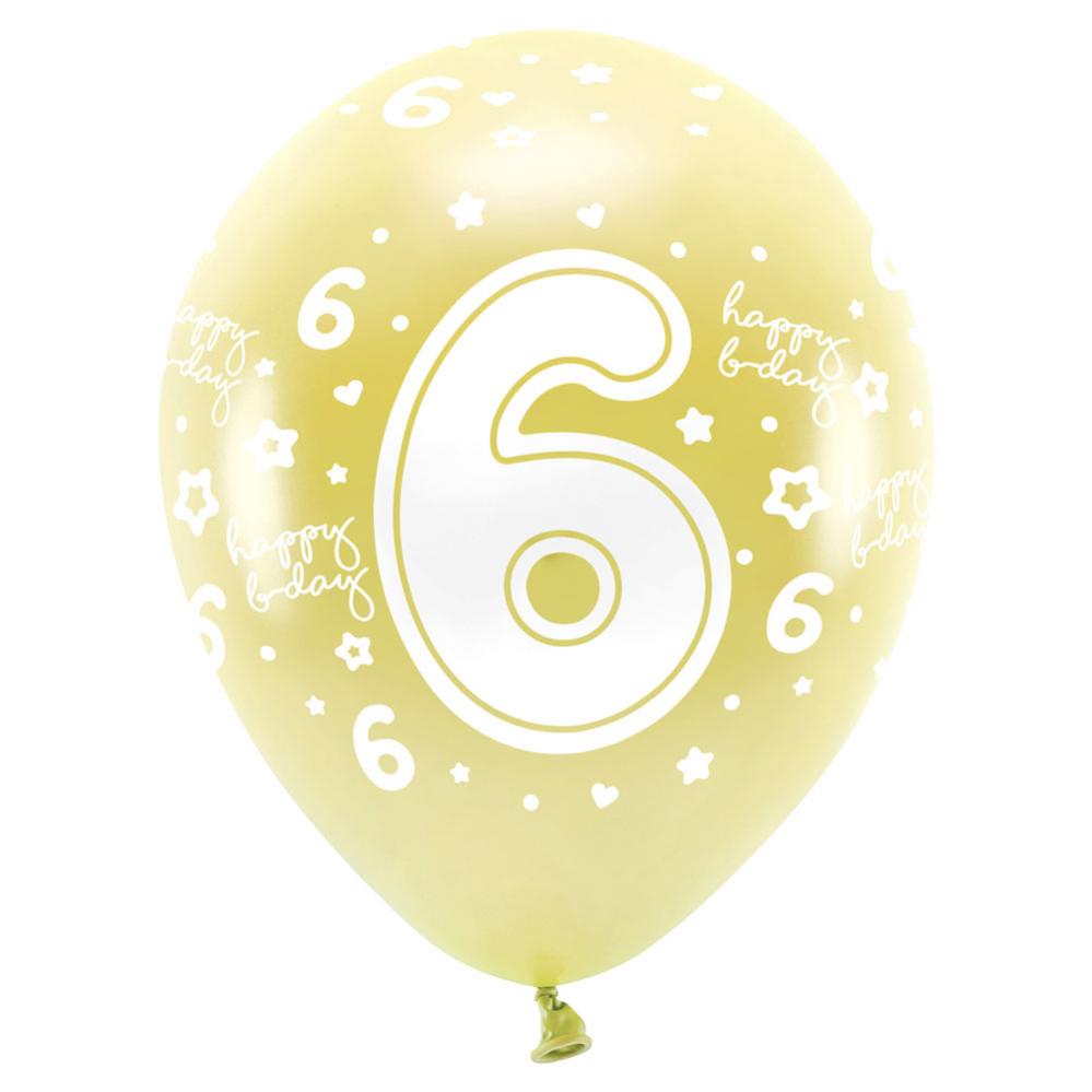Ballonger Metallic Guld Happy B-day 6 omfattar 6 stycken biologiskt nedbrytbara ballonger i latex. Ballongerna är i guld med metallic effekt och har vitt motiv av siffran 6 och texten "Happy B-day". Ballongerna är ca 33 cm stora och rymmer ca 15 liter. Fylls med luft eller helium.