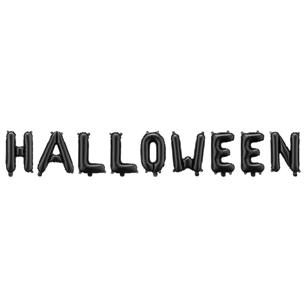 Ballonggirlang Halloween omfattar nio stycken svarta folieballonger som bokstaverar "Halloween", ett band för upphängning och ett plaströr för att blåsa upp ballongerna.
