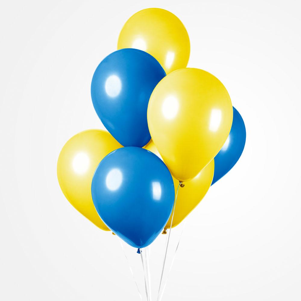 Ballongmix Blå/Gul 10-pack omfattar 10 st blåa och gula latexballonger som är ca 30 cm stora. Ballongerna kan blåsas upp med luft eller helium.
