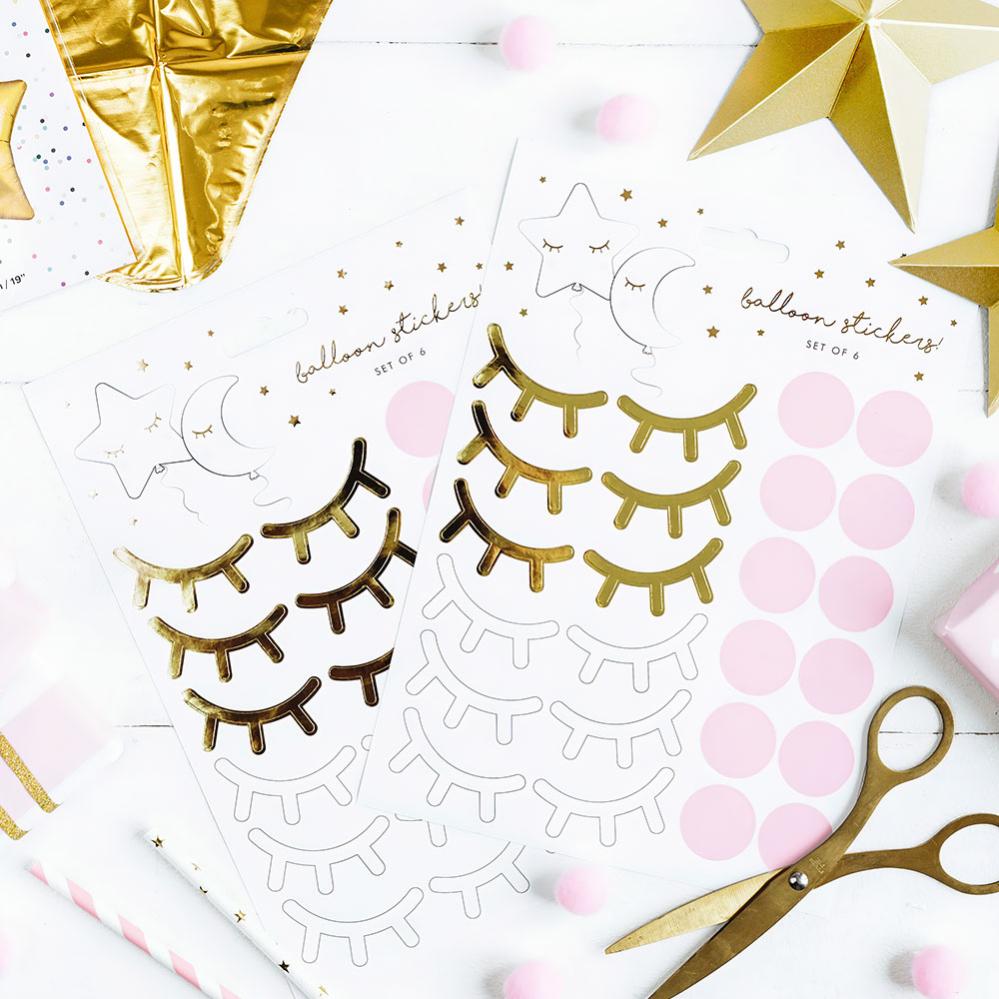 Gör din ballong ännu roligare och finare med party stickers, ett ark med skojiga klistermärken med ögonfransar och rosa cirklar att fästa direkt på ballongen, så vips har du fått en sovande gullig ballong, perfekt för alla som gillar pyssel och såklart extra fina ballonger.