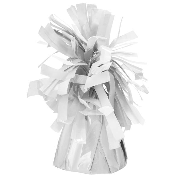 Ballongvikt Vit är en vikt till ballonger som är inslagen i vit pastellfolie och har en ögla upptill för att fästa heliumballonger med ballongsnören.