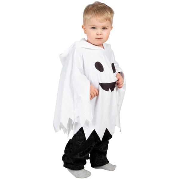 Barnponcho Spöke omfattar en vit poncho med en luva i ett mjukt material och ett spökansikte på framsidan.