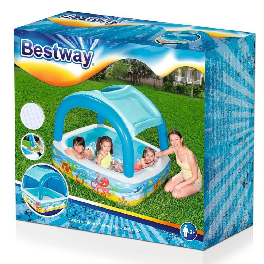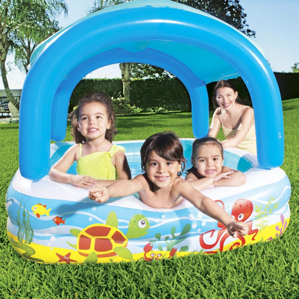Barnpool med Avtagbart Solskydd består av en fyrkantig uppblåsbar barn pool i blått med söta havsmotiv. Poolen har även ett avtagbart solskydd.