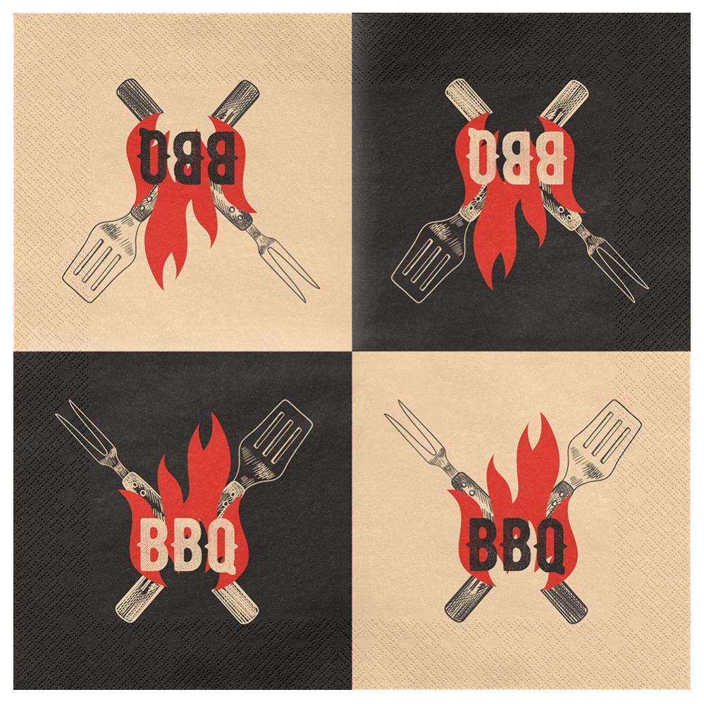 BBQ Pappersservetter 20-pack består av tjugo svarta och beiga engångsservetter i två lager, dekorerade med ett grillmotiv: texten 'BBQ' med en flamma och korsade grillredskap.
