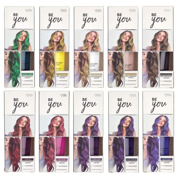 Be You Semi-Permanent Hårfärg omfattar en tub med hårfärg i en av 14 olika färger och nyanser. Färgen är semi-permanent och tvättas ut efter ca 7-15 tvättar. Färgen har bäst effekt på ljust eller bleknat hår, vid behandling av långt hår kan två förpackningar behövas.