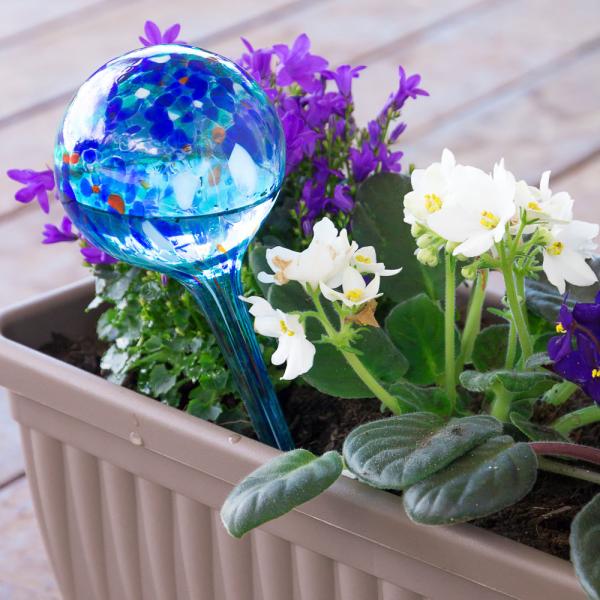 Bevattningsglober Glas Aqua-Loon omfattar två stycken bevattningsglober av handblåst glas. De är ca 30 cm stora, rymmer ca 350 ml styck och kan vattna växter i upp till 10 dagar. Globerna fylls med vatten och sticks enkelt ner i jorden. Kan användas både inomhus och utomhus.