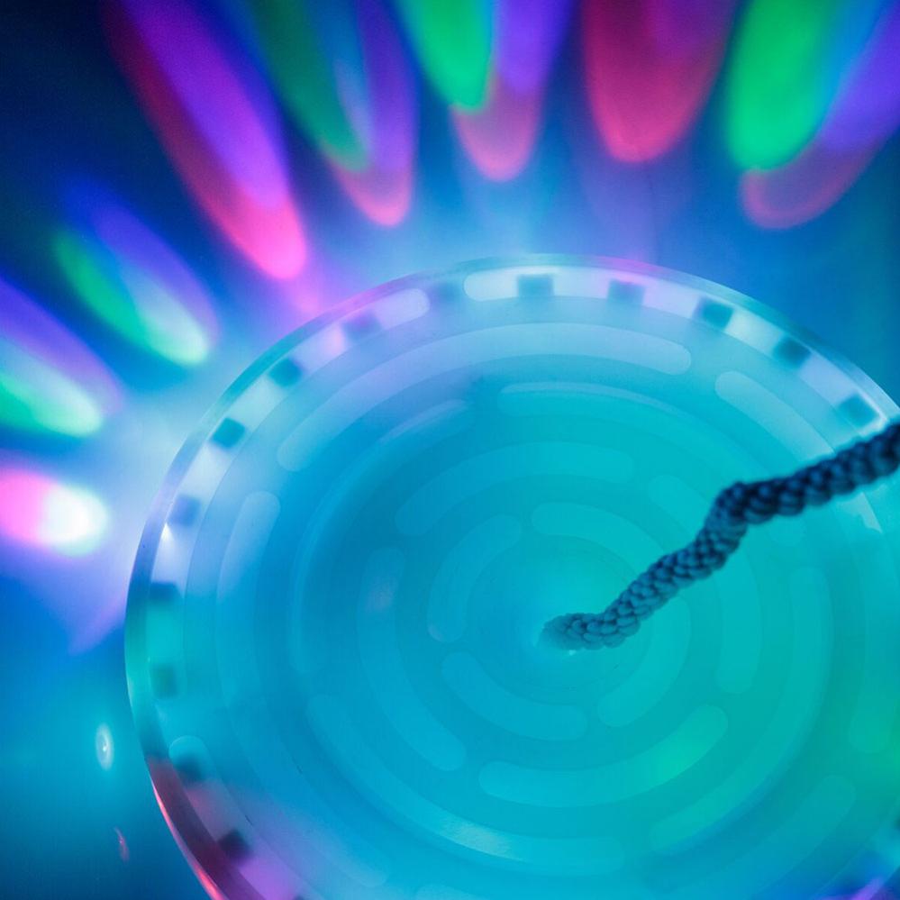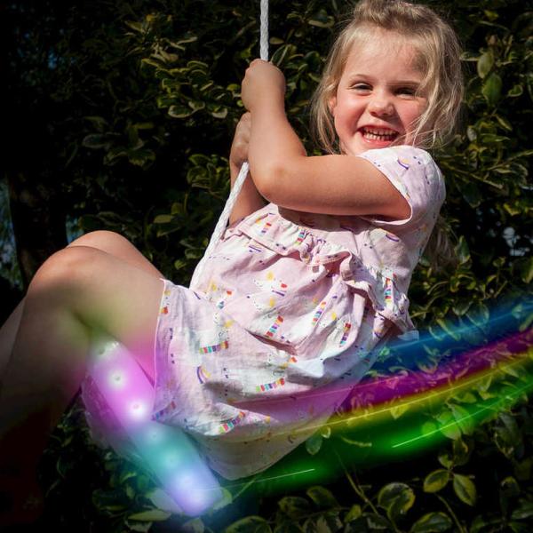 Det blir svårt att hitta en häftigare gunga än den här! Denna barngunga är försedd med blinkande LED-lampor som lyser i olika färger, vilket garanterat får dig att se extra cool ut när du gungar. Svinga dig fram och tillbaka i mörkret och låt den häftiga LED-belysningen lysa upp dina gung-tricks. Denna tallriksgunga kan enkelt fästas i exempelvis en gungställning, en stark gren eller liknande, sen är det bara att starta ljusshowen!