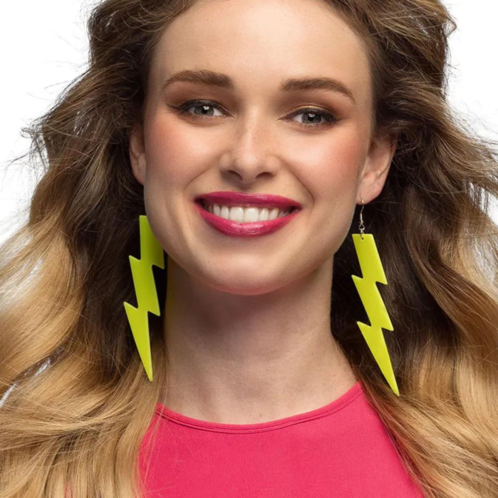 För en maskerad med retrotema passar örhängen i form av blixtar extra bra i färgen gul och är inspirerade av 80- och 90-talet, med en uttrycksfull neonstil. Det lätta materialet och den säkra stängningen gör dem bekväma hela kvällen.