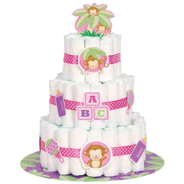För att förenkla din baby shower upplevelse har vi samlat på oss ett kit med enkla blöjtårta dekorationer i rosa, en fin botten och flera band som håller ihop blöjorna så att det blir en snygg pyramid. Det här pyntet till babyshowern är ett av de mest populära, just denna blöjtårta är till en flicka, men låt inte färgen stoppa dig, det står nämligen inte girl eller flicka någonstans på så du kan använda den bäst du vill även om det är en pojke du ska få. Din baby shower tårta av blöjor blir riktigt lätt att sätta ihop när du har alla tillbehören.