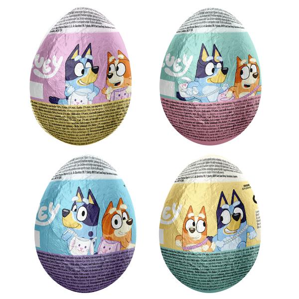 Bluey Chokladägg med Överraskning 20 g är ett chokladägg med 50% vit choklad och 50% mjölkchoklad. Ägget innehåller en leksak med motiv från Bluey.