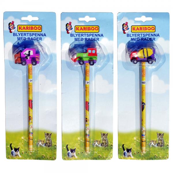 Blyertspenna med Fordon Suddgummi omfattar en blyertspenna med ett stort suddgummi format som en ett av fyra byggfordon i olika utföranden och färger, vilken du får blir en överraskning.