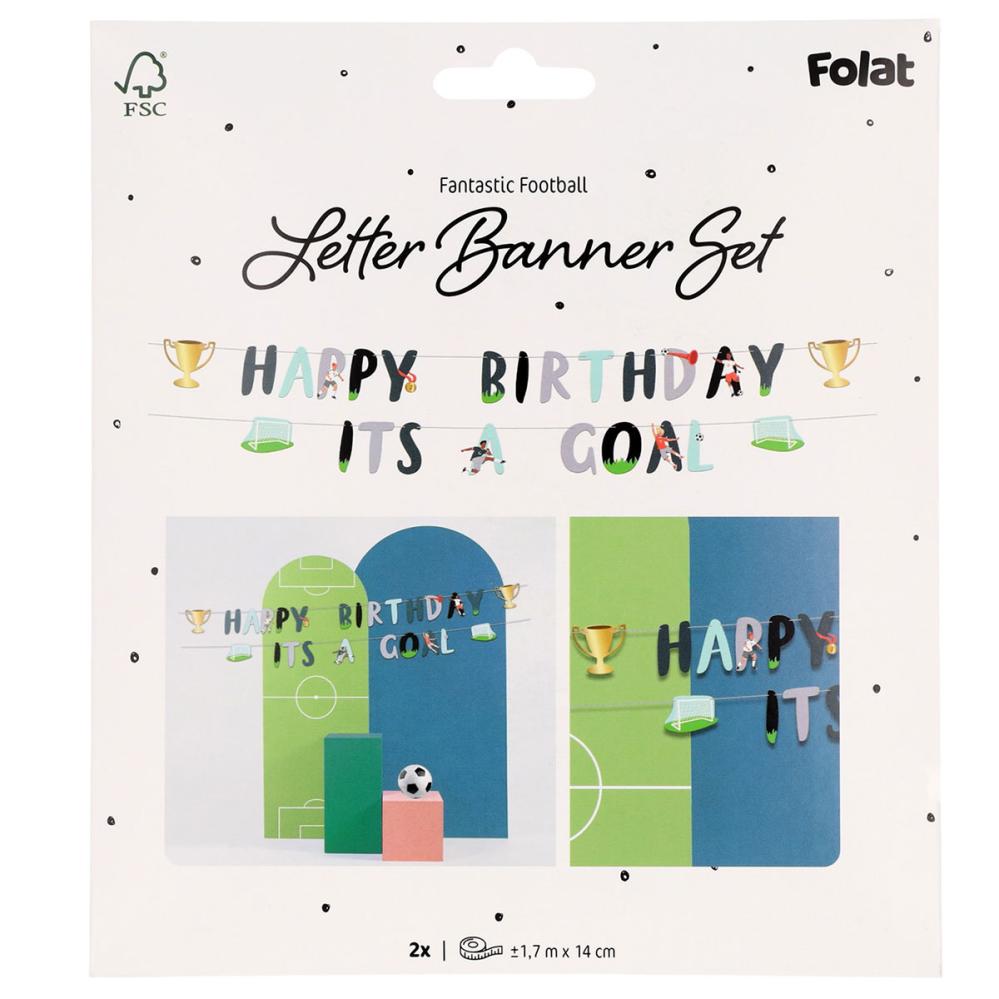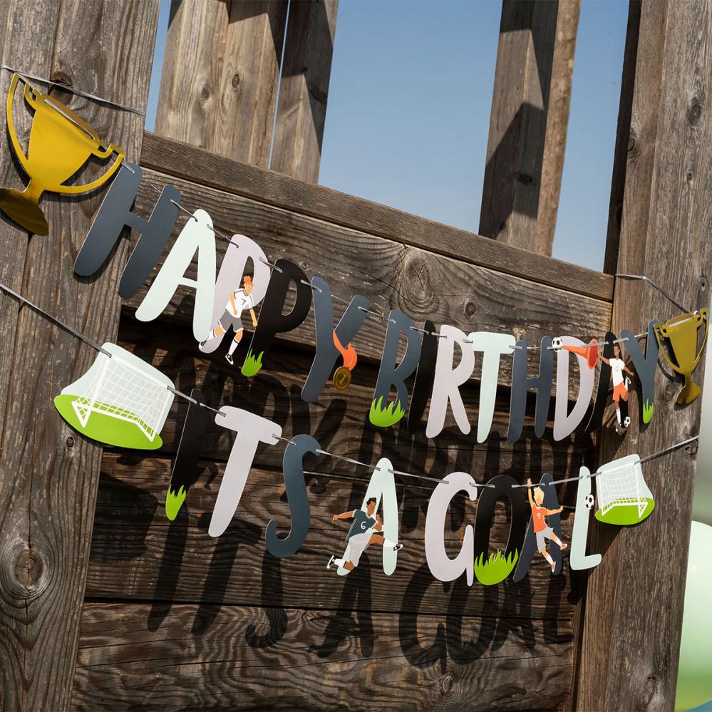 Bokstavsgirlang Fotbollskalas 1,7 m omfattar två pappersgirlanger med fotbollsmotiv som bildar texten "HAPPY BIRTHDAY ITS A GOAL". På ena girlangen står det "HAPPY BIRTHDAY", med en guldfärgad pokal på båda sidor och på den andra girlangen står det "ITS A GOAL" med ett fotbollsmål på båda sidor. Bokstäverna och motiven kan flyttas över de vita polyesterbanden.