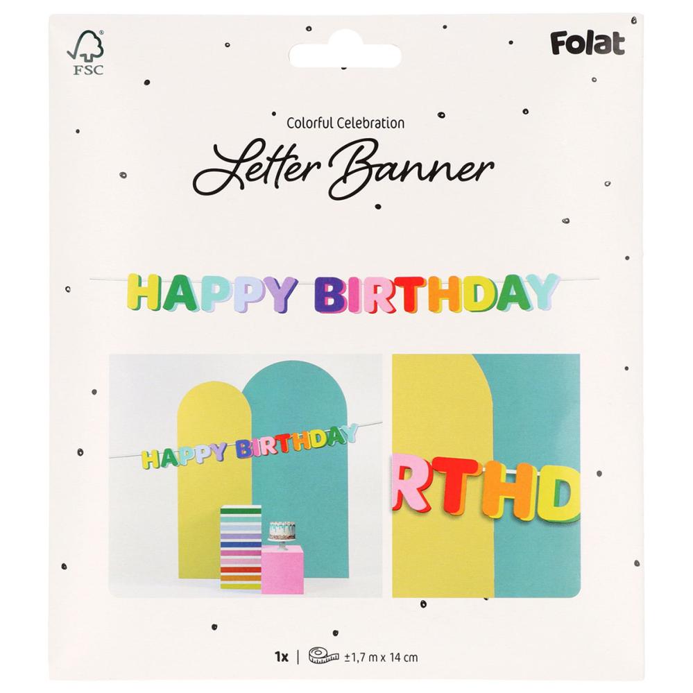 Bokstavsgirlang Happy Birthday Flerfärgad 1,7 m omfattar en färgglad girlang med bokstäver som stavar "HAPPY BIRTHDAY", fäst på ett stilrent vitt band.