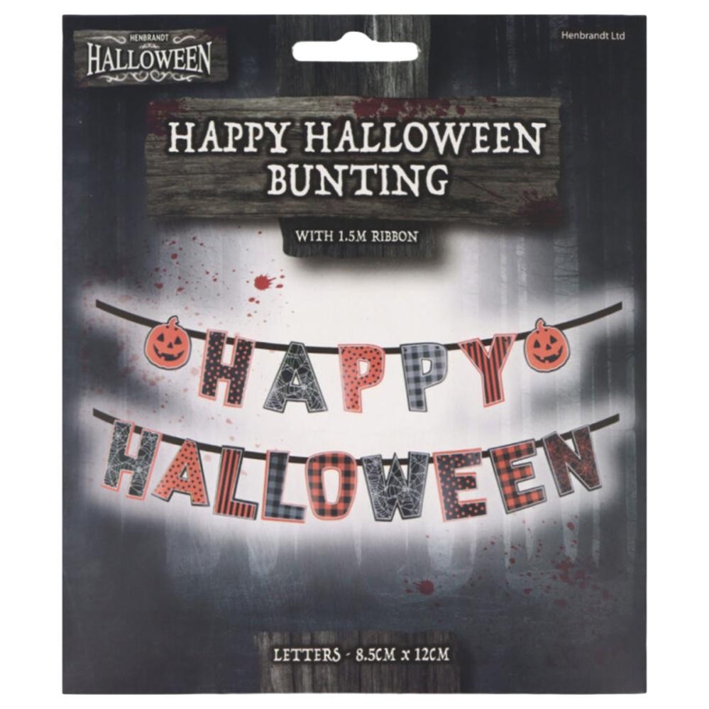 Bokstavsgirlang Happy Halloween är en girlang med bokstäver i svart, orange, vitt och grått som tillsammans bildar texten 'Happy Halloween' och den är dekorerad med två orangea halloweenpumpor. Bokstäverna är fästa på ett medföljande svart band för smidig upphängning.