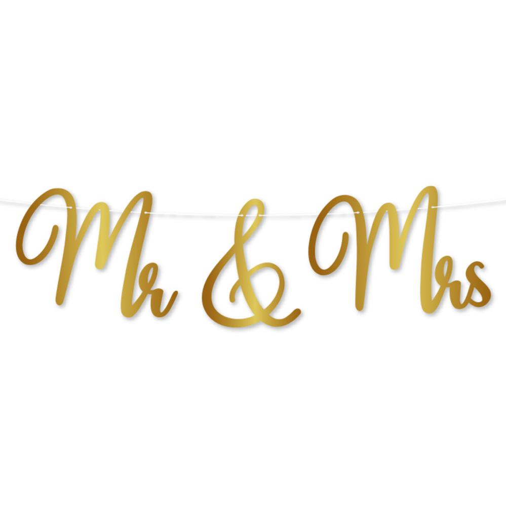 Bokstavsgirlang Mr & Mrs omfattar en girlang som bildar texten "Mr & Mrs" i skimrande guldfärg på framsidan. Girlangen monteras enkelt ihop med hjälp av det medföljande vita polyesterbandet. Tips! Kombinera två girlanger för att bilda "Mr & Mr" eller "Mrs & Mrs".
