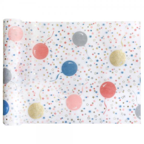 Bordslöpare Kitty Party omfattar en vit engångs-bordslöpare med prickar och ballongmotiv i pastellfärger och skimrande guld. Bordslöparen är tillverkad av polyester och är ca 27 cm bred samt 3 m lång.