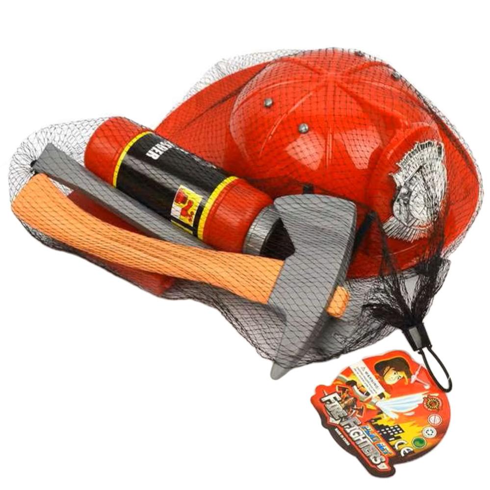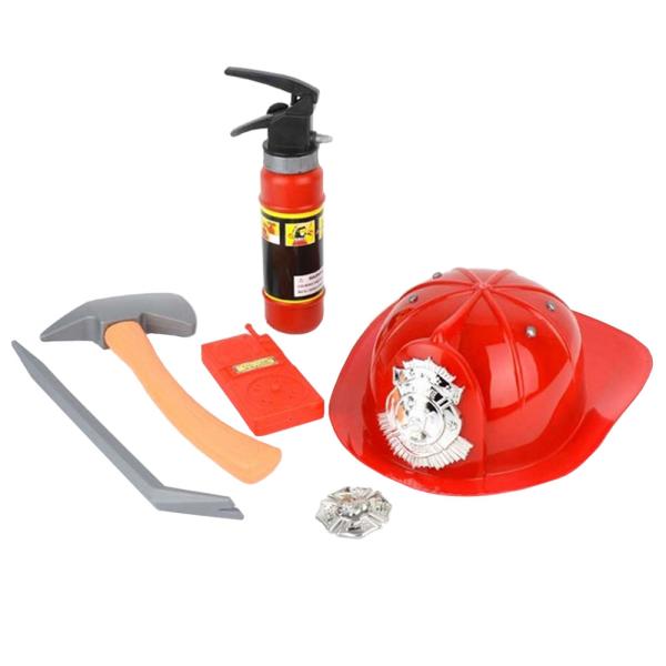 Brandman Set omfattar ett kit med röd hjälm, en kofot, en brandsläckare, en yxa, en radio och en brandman bricka.