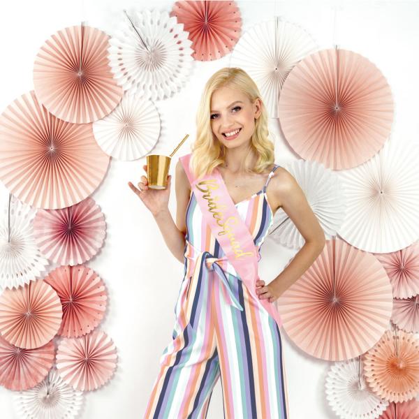 Bride Squad Sash innehåller ett ljusrosa ordensband med snygg, skimrande "Bride Squad" text på. Bandet är tillverkat i 100% polyester.